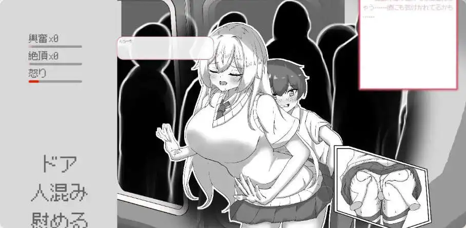 《目標:黄金の巣穴!~満員電車の絶対侵入》是一款以都市通勤电车为舞台的日式成人向互动游戏。在拥挤的车厢中,您将与金发碧眼的少女爱丽丝展开一场充满紧张感与禁忌感的特殊互动。故事背景每天乘坐同一班电车的您,在一次偶然的拥挤中与爱丽丝产生了意外的身体接触。从最初的尴尬回避,到逐渐主动的互动,这段电车上的秘密关系将如何发展?每一次触摸、每一个选择,都将影响两人的关系走向……